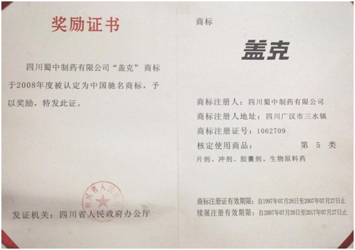公司高度重视品牌战略,依法注册了“盖克”、“蜀中”、“三星堆”、“阿莫锋”、“益善源”、“蓉通”、“朋友换娶4完整版中文翻译”等108件注册商标,1999年“盖克”、2003年“蜀中”、2007年“三星堆”被认定为德阳市知名商标,2001年“盖克”、2004年“蜀中”被认定为四川省著名商标, 2008年“盖克”商标被国家工商行政管理总局认定为“中国驰名商标”。2017年3月,公司盖克牌、朋友换娶4完整版中文翻译牌阿莫西林胶囊和多酶片被四川省人民政府授予四川名牌产品称号。2016年,公司实现营业收入66373万元,利税7600万元;2017年,公司实现营业收入75045万元,利税7572万元。公司2017年被命名为德阳市第七批院士专家工作站,2016-2018连续三年被德阳市人民政府确定为重点龙头企业。